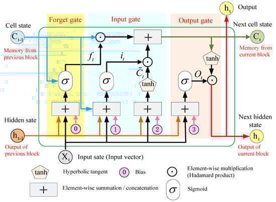 The gating state of the LSTM neural network consists of a sigmoid layer and a pointwise multiplication operation. The Sigmoid layer normalizes the input signal to determine the retained information. The pointwise multiplication operation is to multiply the input data dimension-by-dimension. This operation can protect the original dimension of the data from being destroyed and ensure the composability of the output results of each gate. The LSTM neural network uses input, forgetting, and output gates to protect and control the cell state and transmission state. The input gate normalizes the information of the previous hidden state and the current input information. The forgetting gate solves the gradient attenuation problem by assigning different weights to the control information and transferring the past information to the present moment. The output gate outputs the current hidden state and passes it to the next layer. The LSTM neural network gate structure is shown in Figure 6, where is the batch data with samples and dimensions at time ; is the hidden state at the previous moment; is the learning weight parameter; represents the operation of multiplying by the corresponding element, i.e., the Hadamard product; is the sigmoid function with a range of [0, 1]; and is a hyperbolic tangent function with a range [−1, 1].