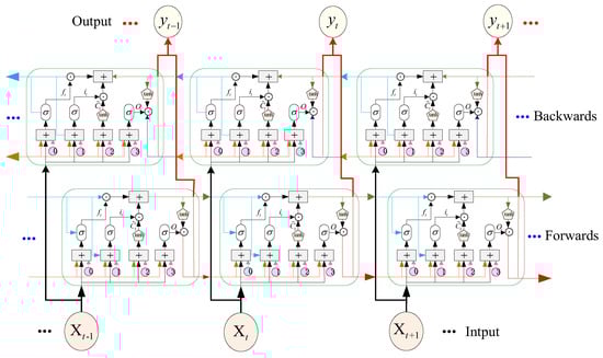 The hidden layers of the LSTM network not only transmit feedforward information but also transmit internal feedback information. The LSTM network can take into account not only current information but also historical useful information. The LSTM network controls the transmission state through the gating state so that the network can remember the information which needs to be remembered for a long time and forget the unimportant information. The LSTM uses constant error flow to solve the problem of gradient disappearance and gradient explosion in time-series data training. The information propagation of the LSTM neural network mainly consists of forward propagation and error backward propagation. Through forward propagation and error backward propagation, each gating unit obtains the optimal weight matrix, bias matrix, and error information proportion according to the cost function. The output layer outputs the training results, which mainly consist of matrix linear transformation and normalization function. The schematic diagram of the single-layer LSTM neural network is shown in Figure 7.