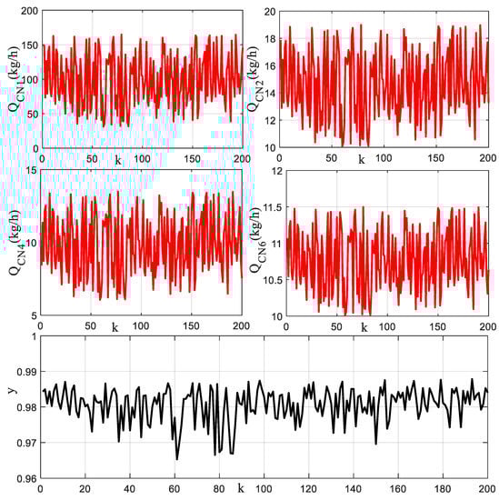 In order to identify the mechanism model’s unknown parameters, the PSO algorithm is used to solve the objective function. The dimension of the particle is taken as . The number of particles is taken as . The number of iterations is taken as . The positive learning factors are taken as and . The annealing constant is taken as . The key adjustment parameters obtained by the identification algorithm are shown in Table 4. The mechanism model can describe the main dynamic characteristics of the cascade leaching system output, as shown in Figure 10. Due to some simplifications in the process of establishing the mechanism model and the noise in the sampled data, there is a large error between the prediction output of the mechanism model and the sampling output. To improve the prediction accuracy of the model, the LSTM neural network will be used to compensate for the output error.