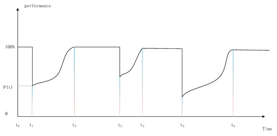 As depicted in Figure 1, earthquakes occur at times , , and . In our research, earthquakes are viewed as instantaneous event. The performance of the resistibility, recoverability, and adaptability of infrastructure systems between two earthquakes may be illustrated using the time period as an example. indicates the time when the infrastructure system is affected by the earthquake; indicates the time when the infrastructure system recovers to its original performance; and indicates the time when the next earthquake occurs.
