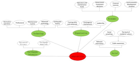 Based on a review and collation of existing literature, 19 key factors were identified that affect the adaptability of infrastructure systems. In the process of identifying factors, factors were discarded that were not relevant to this study or which had a high degree of similarity with other factors. The factor of ‘ground motion’ (vibration of soil near the surface caused by seismic waves released by a seismic source), for example, is referred to in some papers [34,35,36], but the term is synonymous with ‘seismic intensity,’ which is the technical term recognized by the academic community.