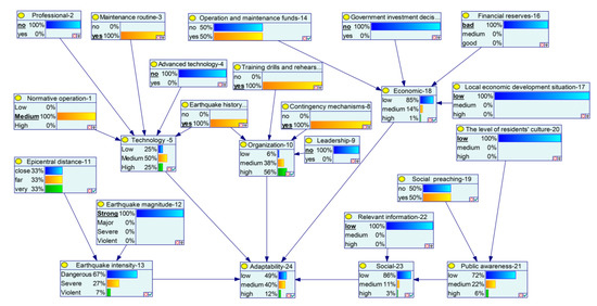 A conditional probability table is used to represent six intermediate nodes and one leaf node. In addition to the earthquake intensity and public awareness described above, the rest of the intermediate nodes, technology, organization, economic and social, and leaf node adaptive capacity are each assigned three states, namely low, medium, and high.