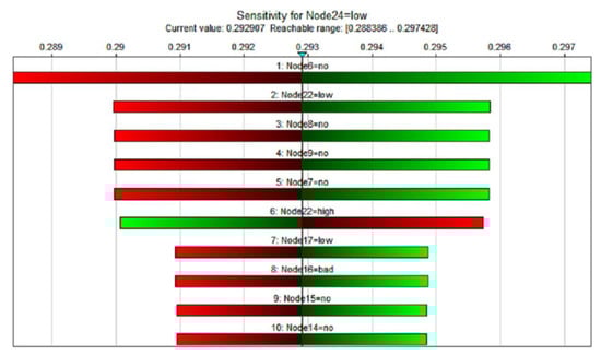 Of the three states of adaptive capacity, we are most concerned about the sensitivity of infrastructure systems in the low state, so we only perform backward propagation analysis for the low state. The color of the bar, as shown in the analysis in Figure 5, indicates the change in direction of the target state; red indicates negative change, and green indicates positive change. The top ten factors and states, critical influencing factors and their impact on adaptability, are clearly displayed. By analyzing the critical influencing factors of the adaptability target node in the target state, in the low state, the top three critical influencing factors are earthquake history (no), relevant information (low), and contingency mechanisms (no).