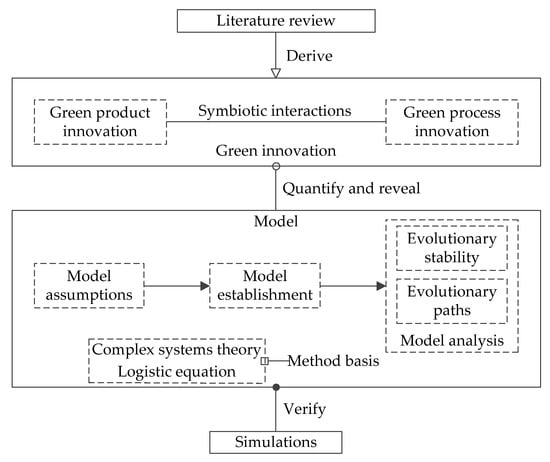 On the grounds of the literature review, green innovation in this paper was viewed as the nonlinear superposition of green product innovation and green process innovation, and we utilized complex systems theory and the Logistic equation to conditionally construct a dynamic model for green innovation with the purpose to quantify the bottom-up evolution of green innovation at the micro level. Through model analysis, we obtained detailed evolutionary stability and paths of green innovation. By setting data, many numerical simulations were performed to verify our model. The methodology proposed in this paper is graphically displayed in Figure 1.