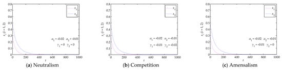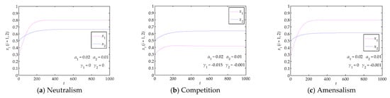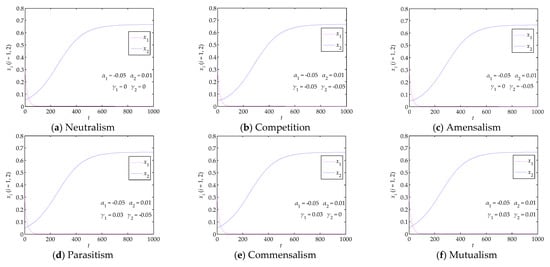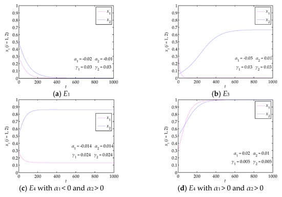 According to Lyapunov stability theory, when an equilibrium point of Equation (2) satisfies and tr J = α1 − 2β1x1 + γ1x2 + α2 − 2β2x2 + γ2x1 < 0, the equilibrium point is a stable point. The stability analyses of all the equilibrium points of Equation (2) are shown in Table 2.