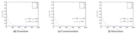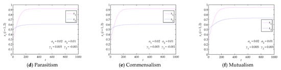 When green innovation stabilizes at E4, six symbiotic interactions play different roles, and mutualism is the optimal symbiotic interaction. Specifically, compared to other symbiotic interactions, mutualism enables SMMEs to realize stable green innovation at higher levels when inputs in green innovation are fixed, as shown in Figure 5 and Figure 6. It should be pointed out that symmetric mutualism (i.e., γ1 = γ2 > 0) outperforms asymmetric mutualism (i.e., γ1 ≠ γ2, γ1 > 0 and γ2 > 0) in green innovation. As shown in Figure 7c,d, green innovation in both dimensions under symmetric mutualism stabilizes at (0.132, 0.858) and (1, 1), respectively; however, as shown in Figure 5f and Figure 6f, green innovation in both dimensions under asymmetric mutualism can only stabilize at (0.125, 0.844) and (0.946, 0.730), respectively; obviously, the former green innovation levels are higher than the latter green innovation levels, for example, (0.132, 0.858) exceeds (0.125, 0.844). We observed similar phenomena and drew consistent conclusions when green innovation stabilizes at other equilibrium points, as shown in Figure 3, Figure 4 and Figure 7a,b.