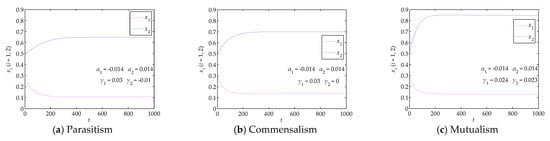 When Equation (2) satisfies α1 = −0.014, α2 = 0.014, β1 = 0.05, β2 = 0.02, γ1 > 0.02, γ2 < 0.05, and γ1γ2 < 0.001, the condition that E4 is the only stable point holds, and the green innovation stabilizes at under the symbiotic interactions of parasitism, commensalism, and mutualism, as shown in Figure 5. Under such conditions, the two dimensions of green innovation grow reversely and always hold a certain level, implying that SMMEs carry out green product innovation and green process innovation simultaneously with obvious differences. When the green innovation stabilizes at E4 with α1 > 0 and α2 < 0, similar evolutions are presented under the three kinds of symbiotic interactions. As a result, this paper did not present the corresponding numerical simulations. In terms of integrality and comprehensiveness, green innovation stabilizing at E4 is superior to green innovation stabilizing at other equilibrium points (i.e., E1, E2, and E3).
