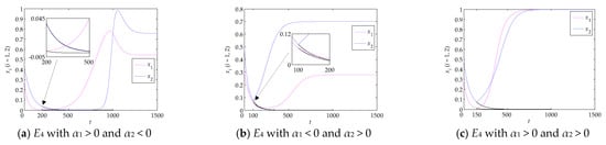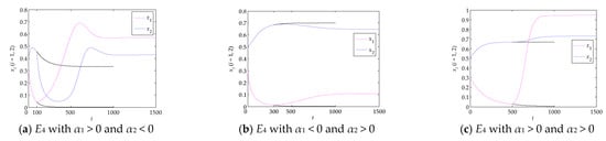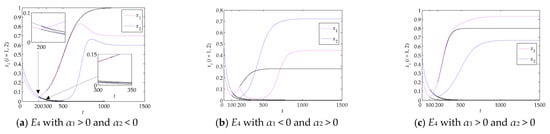 Evolutionary paths from E1 to E4: (a) α1 increases, and , (b) α2 increases, and , and (c) α1 and α2 increase, and ; the corresponding measures are taken at (a) t = 200, (b) t = 100 and (c) t = 150.