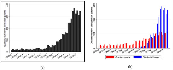 Figure 1a illustrates the quarterly distribution of our sample blockchain patents by type. The distribution of the volume of blockchain patents applied across time reveals the growth of blockchain technology in the past few decades. The number of blockchain patents has been gradually increasing since 2008, particularly with explosive growth after the third quarter of 2017, which coincides with the cryptocurrency bubble period [50]. Figure 1b further displays the same distribution by the two types of blockchain patents. The volume of cryptocurrency patents has increased throughout the years at a gradual pace. In contrast, distributed ledger patents have experienced exponential growth in a relatively short period with the start of the bubble.