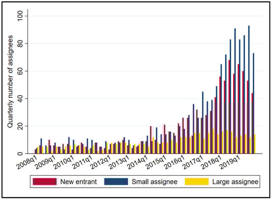 We also coded three different types of assignees associated with sample blockchain patents. We differentiated assignees based on their prior activities in patenting blockchain technology. First, we discerned whether the assignee of each blockchain patent had invented a blockchain patent before (We searched for the entire patenting history of assignees predating the sample period to ensure the accurate identification of new entrants.). If a given patent was the assignee’s first blockchain patent on the date of its application, we defined its assignee as a new entrant.