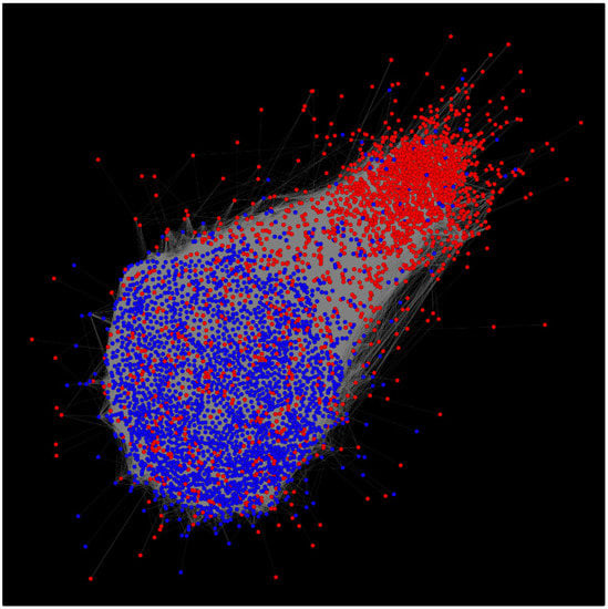 In Figure 4, we visualize the entire blockchain patent co-citation network observed during our sample period. The network was visualized using Gephi 0.10.0 with ForceAtlas2 layout, which simulates a balanced state of a physical system assuming repulsion and attraction between nodes based on the presence of edges between them [53]. Hence, the relatively well-connected nodes have a close distance from each other on a graph. Red-colored nodes denote cryptocurrency patents, while the blue-colored ones represent distributed ledger patents.
