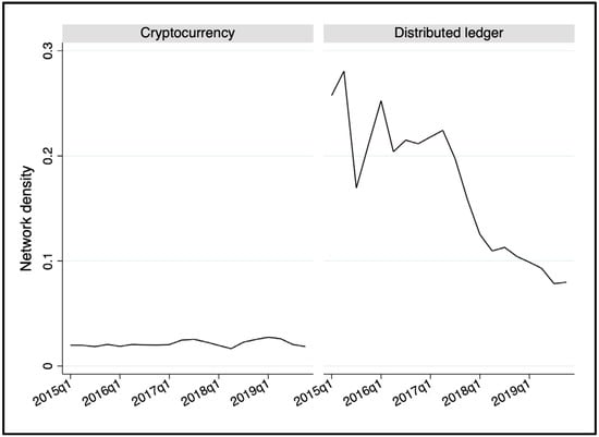 Figure 5 illustrates the changes in the density of our co-citation networks by patent types. The overall density of the co-citation network comprising cryptocurrency patents is much lower than the distributed ledger patents counterpart. Furthermore, the density of the cryptocurrency network does not show much variation across time. This indicates that, throughout the years, cryptocurrency patents have been sparsely connected to others in terms of citing common patents. In contrast, the density of distributed ledger patent networks was high in its early period of emergence. However, the density has drastically decreased in recent years. It is possible to speculate that, in recent years, the distributed ledger technology domain has not only experienced significant growth in the volume of patenting activities but the underlying knowledge of the patents has also become more diversified as well.
