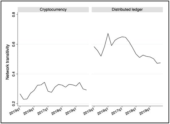 Figure 6 plots the transitivity of our co-citation networks over time. We find patterns similar to the cases of network density. The transitivity of cryptocurrency networks is generally lower, with relatively fewer fluctuations over time than those of distributed ledger patent networks. The distributed ledger network displays a high level of transitivity in the early period, which steeply declines in the later years. The pattern shows that distributed ledger patents were highly interdependent on common underlying knowledge in the initial phase, but over time, they have evolved to be reliant on a more dispersed set of knowledge.
