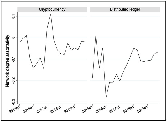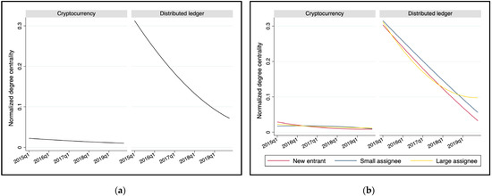 Figure 7 illustrates the degree assortativity of our co-citation networks. For the cryptocurrency network, we observe large fluctuations in the values across time, further obfuscating a clear interpretation of generalizable trends in the networks. This is perhaps due to the inherent instability of emerging technology. For cryptocurrency patents, the patterns of co-citation change drastically from period to period: in some periods, central patents tend to draw on similar sets of underlying knowledge, while in some periods, central patents and peripheral patents are more prone to rely on the same set of previous knowledge. For the distributed ledger network, we find fluctuations in the early period, which we speculate to be originating from the low volume of distributed ledger patents in those periods. However, from 2016 onwards, the network gradually becomes more assortative.