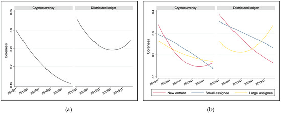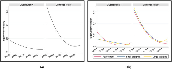 Table 3 provides the list of the 15 largest assignees appearing in our sample. The list is consistent with prior studies on blockchain technology [49,51]. Big financial firms, such as Bank of America and Mastercard, and information and communication technology (ICT) giants, including International Business Machine, Intel, and Amazon, represent larger players in the blockchain technology domain.