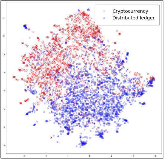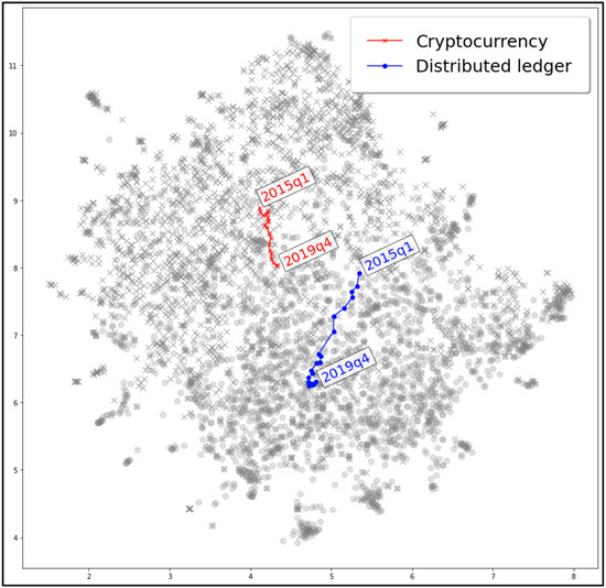 Given the complementary nature of these two methods, we conducted a systematic evaluation of their relationship to determine the extent to which they capture similar or different aspects of the evolution of blockchain technology. To achieve this, we conducted a comparative analysis by comparing the distance metrics obtained from the network space and semantic space. The rationale behind this comparative analysis is to understand the complementarity of the two approaches and determine the extent to which they capture unique aspects of the evolution of blockchain technology [61,62,63]. By comparing the results obtained from the two methods, we aimed to gain a more comprehensive understanding of the dynamics of the development of blockchain technology.