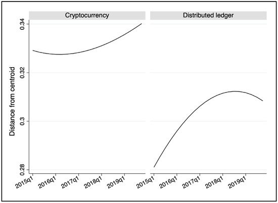 For distributed ledger patents, the increase in the distance seems to be steeper, indicating a greater speed of divergence in this technological domain compared to the cryptocurrency counterpart. However, in the most recent two years, the rate of increase in the distance has decreased. This perhaps suggests a saturation of patents in the semantic space or a reversing trend toward convergence in distributed ledger technology in recent years.