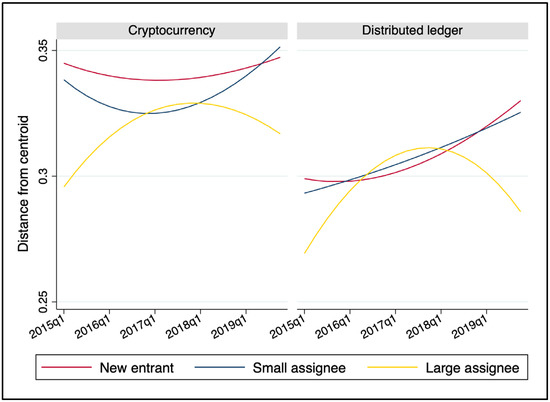 We further examined whether the distance from the centroid varies across different types of assignees. Figure 14 plots the same polynomial fit by different assignee types. In both technological domains, the patterns clearly illustrate that new and small assignees have been filing patents that are more dissimilar from previous patents. The large assignees, on the other hand, in more recent years, perhaps after the burst of the bubble, tend to develop patents that are less dissimilar to the preceding patents. Our patent-level analysis of vector representations of patents using BERT shows that different types of players active in the blockchain technology domain engage in patenting activities with different levels of innovations.