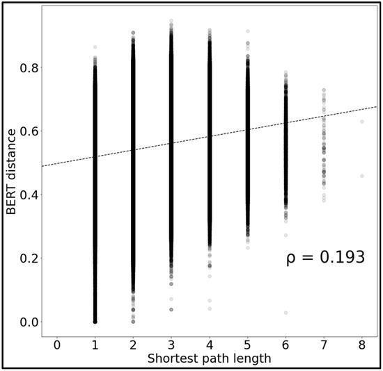The co-citation network analysis and semantic similarity analysis both captured similar dynamics in the evolution of blockchain technology. We conducted one additional analysis to check how the two approaches relate to each other systematically. To do so, we compared the distance metrics obtained from the network space and semantic space. First, we computed the shortest path length between every pair of patents in the co-citation network. A path length of i is assigned to a pair of patents if they can be reached in ith step to each other, with a path length of 1 indicating a direct connection (i.e., presence of a co-citation tie) between them. Second, we computed the cosine distance between every pair of patents using their vector representations obtained from PatentSBERTa.