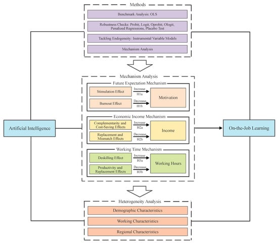 Therefore, based on a theoretical analysis, it is unclear whether artificial intelligence promotes or inhibits on-the-job learning. In the current context of the booming AI technology and digital transformation of industries, promoting employees to learn new skills that can facilitate collaborating with AI is crucial for enterprises to improve their competitiveness [,]. In light of this, this paper empirically examines the impact of AI on on-the-job learning using the data from the Chinese general social survey (CGSS). In addition, this study conducts a series of robustness and endogeneity tests by applying different AI and on-the-job learning measures, ordered response models, instrumental variables approach, penalized regressions, placebo tests, etc. We also systematically explore the future expectation, economic income, and working-time mechanisms through which AI affects on-the-job learning. Furthermore, the heterogeneities of AI’s influence in terms of demographic, working, and regional characteristics are further explored.