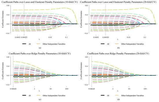 Given that the existing literature has not yet focused on the impact of artificial intelligence on on-the-job learning, we further test the predictive and explanatory power of AI on further learning in comparison to other factors. To achieve this, this paper first utilizes the lasso model of machine learning for analysis. We calculate the optimal penalties using both 10-fold and 20-fold cross-validation methods and obtain the two optimal penalty parameters of 0.00025 and 0.00039, respectively. As shown in Columns (1) and (2) of Table 9, under the optimal penalties, AI is among the non-zero independent variables in both models with negative estimates. This implies that AI is an important predictor of workers’ on-the-job learning frequencies. Subsequently, we use the Ridge and Elastic net models for estimation. The optimal obtained in the Elastic net model is 1, indicating that it is equivalent to the lasso model. The results demonstrate that AI is a necessary predictor of on-the-job learning in all the penalty models. To visually and intuitively analyze the changes in the coefficients of different independent variables as the penalty parameter increases, we further plot the change paths of independent variables’ coefficients for each penalized machine learning model, as shown in Figure 2, where the coefficient paths of AI are the black bolded lines. It is demonstrated that, first, none of the AI’s estimates converge to 0 at the optimal penalties in these models, consistent with the estimation results in Table 9. Second, the estimated coefficients of AI converge to 0 only when penalty parameters are very large when few variables are not penalized to 0. This suggests that the explanatory power of AI for on-the-job learning is very robust compared to other factors.