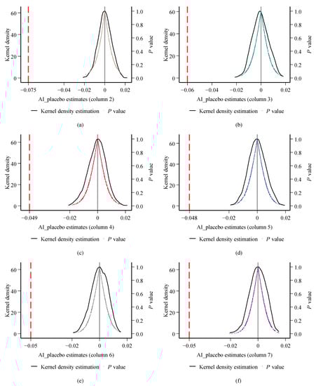 We have examined the impact of artificial intelligence on on-the-job learning from different perspectives, but there is still a concern that the statistical significance of AI’s estimates may be due to uncontrolled random factors. If this speculation is true, the results of this paper would not be valid. To address this concern, placebo tests were conducted. Specifically, we randomly assigned the AI indicator in the sample 1000 times to obtain the placebo explanatory variable , and then used these 1000 new samples for regression to estimate the impact of on on-the-job learning. The estimated results are plotted in Figure 3, where the six sub-figures are the placebo test results performing the benchmark regressions in Columns (2)–(7) of Table 2, with the stepwise addition of control variables. The black solid lines are the probability density curves of ’s estimated coefficients in regressions with the 1000 new samples. The colored scatters are the P values corresponding to the estimates of . The red vertical dashed lines signify the estimates of benchmark regressions in Columns (2)–(7) of Table 2. It is clear that the distributions of coefficients are all basically centered on 0, showing a near-normal distribution in all regression models. The colored scatters, which are the P values corresponding to the estimated coefficients of , are almost all higher than 0.1. More importantly, the estimated coefficients of benchmark regressions in Columns (2)–(7) of Table 2 are all much smaller than the 1000 placebo estimates. This proves that the magnitude of the relationship between AI and on-the-job learning owing to chance factors is far from the results obtained in benchmark regressions. Therefore, this provides evidence that the effect of AI on further learning is not due to uncontrolled random factors.