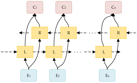 As a very important model, the GRU model has many significant advantages. It performs semantic analysis by discarding some words that are of little significance to our understanding of the information. It has been successfully applied in some fields. However, the GRU model only extracts the semantic impact of the above text on the text, and cannot fully reflect the information impact of the following context on the text above. Therefore, this study uses a bidirectional gated recurrent unit for feature extraction. BiGRU consists of forward GRU and backward GRU, it can capture the forward and reverse semantic information at the same time, and combine the context to extract the emotional features contained in the text deeply. The structure is shown in Figure 5. L represents the GRU network for feature extraction from left to right, and R represents the GRU network for feature extraction from right to left. Then, the semantic information vectors extracted from the R layer and the L layer are fused and spliced to obtain the final feature extraction results of the BiGRU model.