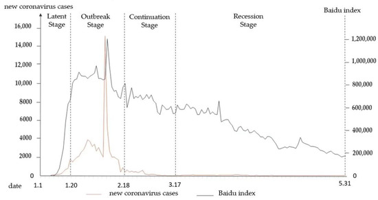 Baidu Index [48] is a data-sharing platform based on the behavioral data of the massive netizens in Baidu. It is based on the search volume of netizens and takes keywords as statistical objects. Through scientific analysis, the search frequency of each keyword in Baidu is calculated. Taking “COVID-19” as the keyword, this paper obtains the Baidu Index from 1 January 2020 to 31 May 2020. Combined with the officially announced daily number of newly confirmed cases of COVID-19. In this way, we can measure the severity of COVID-19 and the hot topics of public opinion discussion, and draw the trend of public opinion development. As can be seen from Figure 7, the trend of newly confirmed cases of COVID-19 is basically the same as that of public opinion discussion. In the theory of crisis communication, Steven Fink [49] divided the life cycle of public opinion into Prodromal, Breakout, Chronic, and Resolution. For better research on the changing trend of public sentiment in different stages, we choose 20 January, 18 February, and 17 March as the cut-off points, and divide the evolution cycle of public opinion into four stages: latent stage, outbreak stage, continuation stage, and recession stage.