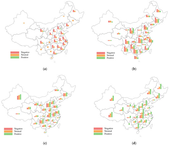 Different spatiotemporal emotion distribution maps. (a) Public emotional distribution in the latent stage; (b) Public emotional distribution in the outbreak stage; (c) Public emotional distribution in the continuation stage; (d) Public emotional distribution in the recession stage.