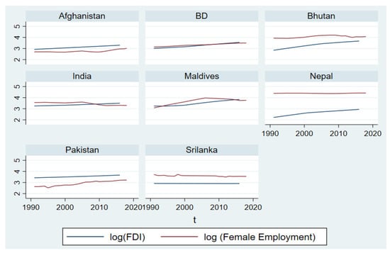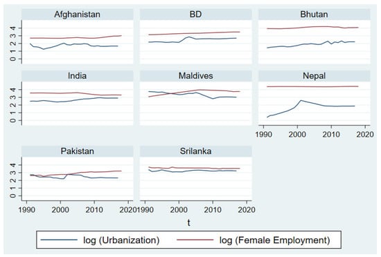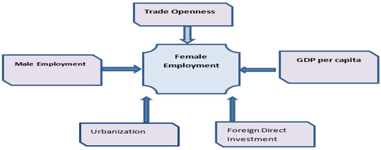 The research carefully selects variables, which are highly correlated with women’s employment. Increases in export capacities and trade liberalization policies have contributed to a dramatic expansion of trade [14]. As a result, women’s ability to work has been increasing. Recently, export processing zones (EPZs) have been booming in the SAARC area. On the other hand, the female wage rate is lower than that of males in informal sectors of the south Asian region. Similarly, FDI is flourishing in south Asian countries. Women’s employment opportunities are directly related to how much FDI enters a country. In urban areas, women are more secure working than in rural areas. Therefore, urbanization is essential when we consider women’s employment. On the other hand, the more per capita income rises, the more family expenses also rise. The rising family expenses push women to access the job market. In contrast, male participation in the labor force encourages women to participate in the job market. In addition, the research selects eight SAARC countries because trade is booming in SAARC. Additionally, in SAARC countries, women’s employment is rising. Urbanization and per capita income are sharply rising in south Asia. To the best of our knowledge, such work has not been conducted in SAARC.