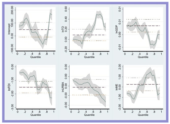 Quantile regression coefficients and confidence intervals for the relationships between FE, TO, GDP, URBA, FDI, and ME, and their interactions, are shown in Figure 5. Detailed results for a range of quantiles from the 0.00th to the 1.00th, with a 0.20-step interval, are provided. After appropriate smoothing, data are presented with estimated coefficients and a 95% confidence interval.