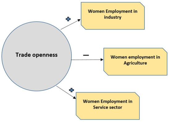 Similarly, male participation encourages women to take up the jobs. Therefore, the variables we selected are highly related to women’s employment. Women’s participation is mainly found in the service, industry, and agriculture sectors. This study’s secondary objective was to examine the impact of trade openness on women’s involvement in these three industries.