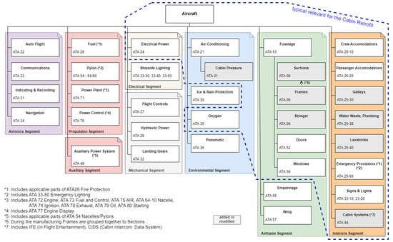 Not least because of the high safety standards and concomitant record requirements, there is elaborate documentation in aviation. To support the organization of the vast number of documents and across the many stakeholders, in 1965 the Air Transport Organization (ATA) published a numbering system. Since its publication, these so-called ATA chapters, formally called ATA Spec 100, have become the referencing standard for commercial aircraft documentation [6]. The iSpec 2200, published by ATA in the year 2000, extends this system and updates it to better include current technology. In the industry, many documents or visualizations are labeled using ATA chapters to declare which element of an aircraft is referenced. Not uncommonly, ATA chapters are even used within file names or workgroup titles. As these chapters clearly define different systems and elements within an aircraft, they can also be used as a base for an aircraft system architecture. Referencing the ATA Spec 100, Jackson created a visualization of a typical aircraft system architecture and its ATA chapter correlation [7]. Based on his work, Figure 2 shows a typical aircraft system architecture, adapted to include more details about elements relevant to retrofit. The retrofit of commercial aircraft typically focuses on elements related to the cabin; thus, the most relevant elements of the system architecture are highlighted. Additionally, the aircraft system architecture was adapted to include elements of lower levels within the cabin, such as galleys and lavatories. Newer elements such as cabin systems (ATA 44), including the in-flight entertainment (IFE) or digital cabin intercommunication data system (CIDS), are added as well. Albeit targeting the documentation within aviation, the ATA chapters and the derived aircraft system architecture provide a good and structured base.