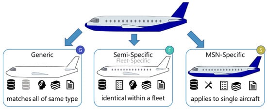As the number of types of occurring aircraft is manageable but nevertheless all aircraft of the same type are not equal, the specificity of information becomes a key factor in handling the data: Some of the relevant information is airframe-specific, while other information is generic and can be applied to other aircraft as well. Generic information only needs to be modeled once and then can be applied to other specific models as well, while specific information is only relevant for a specific entity of aircraft. Each of those individual and unique aircraft is identifiable by its manufacturer serial number (MSN), allowing for a simple association of specific information. Additionally, with aircraft often being operated as part of an airline’s fleet targeting a specific route or range, the cabin itself as well as the operations and maintenance cycles are also comparable for a specific number of aircraft. Thus, when an aircraft is part of a fleet, information that is available from a previously handled sister aircraft can still be more accurate than the generic information of the aircraft type. In any case, it is better than having no information at all. Here, tracing the source and the reliability of information is essential. These three described basic levels of specificity—the state of being specific rather than general—are depicted in Figure 4. With a more diverse structure within airlines and their fleets, a more granular distinction might be possible. However, this article focuses on these three intuitive levels to describe the general approach.