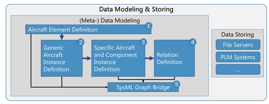 While PLM systems are used at times, they also face the challenges of system discontinuities and, thus, are mostly focused on the digitally available data of one single stakeholder. Additionally, they are currently mostly used from the perspective of a manufacturer or designer, managing the data of a product from its idea up to production, and not specifically considering every single created entity of the product after its production. From the view of the manufacturer, the bill of materials (BOM) is often the base for the physical item hierarchy, also defining the connections and interdependencies between single models and information. Within this context, Rios et al. state that “current PLM systems treat the product as a type of product and not as a unique digital instance that could have a one-to-one link with its corresponding physical one” [8], as would be needed for the planning of the retrofit. Additionally, with the BOM-orientated structure, meta-information-like relations and interdependencies between data and separate documents are often not documented sufficiently. With all the presented factors of the process of retrofitting aircraft, the need for a thorough representation of individual specific airframes and also the challenge of creating and maintaining these representations become obvious. For simply storing CAD, PDF, and other files, there are already many implementations ranging from PLM systems to new approaches such as using multi-model databases (MMDs) [9,10]. Because of the given structures, the handling of data, especially the metadata such as relations, interconnections, and interdependencies between entities, becomes a key factor. Because solely BOM-oriented handling does not meet these requirements by itself, an additional layer focusing on the management of the occurring and needed metadata is required.