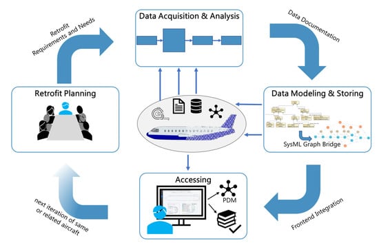 Aviation is characterized by a unique combination of circumstances: Complex products with long lifespans encounter many stakeholders. High safety standards and maintenance procedures require thorough record keeping and also result in a vast number of documents. Whenever an aircraft is retrofitted with a new cabin—approximately every 5 to 7 years—the organization planning and executing this retrofit is faced with the challenge of designing a cabin that perfectly fits into the unique airframe without having a simple-to-use representation of the specific asset. Because at the time of planning, the aircraft is still in operation and flying around the world, a simple acquisition of the current state is often not feasible. Instead, the engineers plod through the pile of documents, often only knowing where to look next based on experience. While aviation standards such as the ATA chapters help by providing a common referencing standard, many dependencies between documents, which originate from the conjunction of different domains and elements within an aircraft cabin, are still hard to manage manually. After presenting the state of the art in aviation documentation and approaches regarding the handling of data occurring in other domains, this article has presented a model-based approach to assist in the handling of the documentation needed for the retrofit in aviation. Structured digitalized documentation is created by first defining generic information about aviation and aircraft, thus providing a basis for specific implementations while also improving the reusability of information. Subsequently, information specific to a single aircraft is added to the system model. The modeling is extended by a bridge from the created system models to a graph database. This allows for easy integration into user interfaces and furthermore enables usage of data science algorithms later on. The modeling approach is embedded into an overarching procedure, based on CRISP-DM, which also includes the definition of the retrofit as well as the phase of data acquisition.