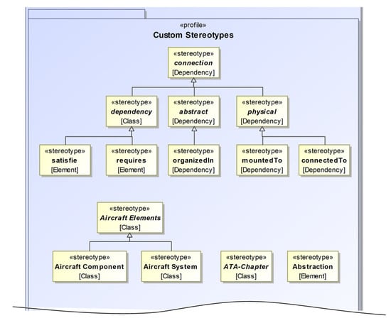 Initially, only for the first creation of a model and before modeling the most generic information of an aircraft type, the elements and relations available for modeling are initialized. This is done by defining the respective stereotypes within a custom profile. Figure 10 shows an extract of the system model including this definition. For the subsequent modeling, this simple definition is sufficient. However, it is planned to define the available model elements and their possible connections in more detail using a system similar to a meta-model. On the one hand, this leads to a clear framework and ensures compatibility; on the other hand, it is good modeling practice to define the used elements and possibly refer them to similar elements from the available modeling languages. That way, custom and reused stereotypes can be distinguished more clearly.