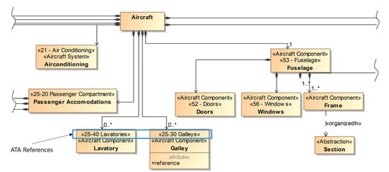 With this modeling on the meta level finished, the ATA chapters are instantiated as stereotypes, allowing specific relations to the relevant chapters from different places within the model later on. Afterward, the modeling follows the described levels of specificity, starting with the generic data of a specific aircraft type, in this case, an Airbus A320. The generic cabin structure of an A320 including all relevant elements (components and systems) is first to be modeled. At this point, it is only defined as a product structure. These definitions then act as a template of the available components, which can later be used for the aircraft-specific definition using instances. As the ATA chapters are already defined, the elements can be easily referenced by applying the stereotypes (see Figure 11).
