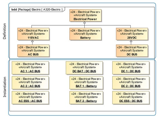 The shown aircraft structure definition is extended in multiple additional views. In the more detailed view, the relevant subsystems of the electric systems are defined, as an A320’s electric system consisting of 115 V AC systems with an AC BUS, batteries, and 28 V DC systems with a DC BUS. Besides this more detailed definition, Figure 12 also shows the instantiation of specific instances of these systems. Because of redundancy, there is not only one 115 V AC BUS in an A320 but three: AC 1, AC 2, and AC ESS (essential). Similarly, there are multiple batteries and DC BUSes that are instantiated at this point. Because of this setup, components now can either refer to the general system (DC BUS) or, if known, to the specific BUS (DC 1) they are connected to. This allows for a more detailed definition while also having a fallback to generic information in case the more specific information is not available. This approach, inspired by the concepts within MBSE, also allows for different levels of details to coexist. Once necessary or available, more information can be added without invalidating the already existing/modeled information.