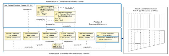 Apart from the hierarchical structure, the defined cabin structure does not include interfaces and connections between elements; hence, the next step is the modeling and generic definition of these connections. Each typical galley, for example, needs to be connected to the 115V AC electrical system as well as potable water. Here, the single-source-of-truth aspect comes in handy, as the elements can be reused from the model containment tree within the authoring tool because they were already created during the previous definition of the generic cabin structure. On this generic level, for example, it is not defined to which AC BUS a galley has to be connected, but that there needs to be a connection to one. Another core generic definition is the instantiation of the generic A320 airframe, including the instantiation of the sections, their included frames, as well as elements such as doors (cf. Figure 13). Again, these elements have been defined on a global level and are now instantiated, or, if already instantiated elsewhere, reused. With these instantiations of the frames, their individual frame reference number, as well as X-position in aircraft coordinates, can be defined. This will later allow for the filtration of results, e.g., based on a given section, frame, or X-position. Additionally, a reference to a source or document is given. In this case, it is the Aircraft Maintenance Manual, ATA 06-10 (Dimensions and Areas). An abstracted extract of a possible example including the respective information is added to the visualization.