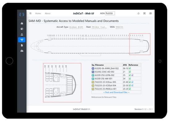 The graph database is finally used from within a web application, allowing the engineers easy access to the information. The user interface in Figure 15 shows a generic overview in the form of an A320′s base airframe, including referenced frames. The user can enter a type of aircraft, define a fleet, or use a given manufacturer serial number to possibly preselect a respective dataset. Based on a selected area of interest (red dotted area), a more detailed view is given together with a first list of referenced and relevant documents. The levels of specificity (cf. Figure 4) are listed as well as filenames and the possibility to access the files if linked respectively. While many more queries and accesses to the graph database are conceivable and currently in the works, this example gives a first introduction to possible use cases.