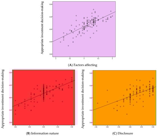 The simple linear regression is used for measuring how the dimensions of independent variables (Information Nature, Disclosure, Perception, Internal factors, External factors, and Information Technology) are effect on the dependent variable (appropriate investment decision). The significance of a regression equation (influence) is then evaluated with the test (F), and the coefficient of determination (R2) is used to account for the variance that remains after controlling for the variables that affect the suitable investment decision-making variable.