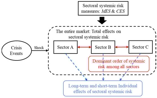 Motivated by the above realistic situations and related works, we address the key aims of this study as follows: (1) Measure the systemic risk level of all sectors in China’s financial market more comprehensively and accurately, especially during the financial turmoil periods. (2) Explore the different situations in terms of the total effects on sectoral systemic risk based on three various crisis events in China’s financial market. (3) Capture the variations in the individual effects of sectoral systemic risk in order to compare the reactions of all entity sectors to these crisis events. (4) Construct the dominant order of systemic risk among all sectors to illustrate the relative position of each one in the various systemic risk connections during crisis events. More specifically, by employing the two measures of systemic risk, the component expected shortfall (CES) and the marginal expected shortfall (MES), this paper empirically researches the differences in the average effects and total effects of sectoral systemic risk in China’s financial market using a panel event study model between the periods of three main black swan events: the deleveraging policy implementation of the A-share market in 2015, the announcement of the US placing additional trade tariffs on China’s goods in 2018 and the COVID-19 outbreak in 2020. Moreover, two nonparametric methods are utilized, the Wilcoxon signed rank sum test and the bootstrap Kolmogorov–Smirnov test, to investigate the change level in individual effects and the dominant orders of sectoral systemic risk in different industries during black swan events. Figure 1 is the theoretical diagram of this paper.