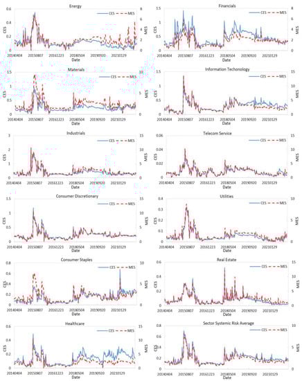 Finally, according to Equations (11) and (12), the time-series measures of Marginal Expected Shortfall and Component Expected Shortfall can be computed by following the estimation processes above. Similarly, the in Equation (4) is calculated to indicate the proportion of systemic risk level in each sector. In short, we apply the construction frameworks of and CES as our main measures in order to estimate the systemic risk of the different sectors in China’s financial system; this could ensure the robustness of the results and help to make a comparison between two aspects of the marginal contribution and the absolute contribution of sectoral systemic risk to the market.