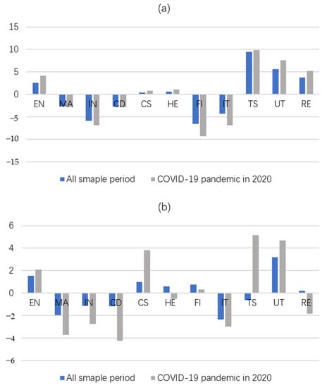 The plots of net values of bootstrap Kolmogorov–Smirnov statistics of CES and MES of each sector during the periods of all the samples and the COVID-19 pandemic. (a) The net values of bootstrap KS statistics of CES. (b) The net values of bootstrap KS statistics of MES.