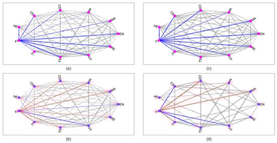 The plots of dominant orders of sectoral systemic risk highlighted with Healthcare. (a) The dominant order of CES during all sample period. (b) The dominant order of MES during all sample period. (c) The dominant order of CES during COVID-19 crisis. (d) The dominant order of MES during COVID-19 crisis.
