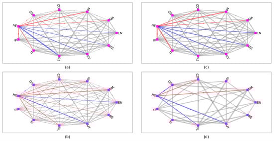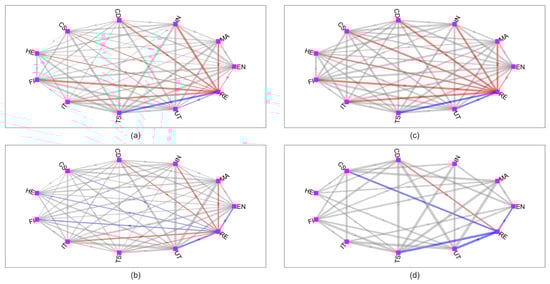The plots of dominant orders of sectoral systemic risk highlighted with Financials. (a) The dominant order of CES during all sample period. (b) The dominant order of MES during all sample period. (c) The dominant order of CES during COVID-19 crisis. (d) The dominant order of MES during COVID-19 crisis.
