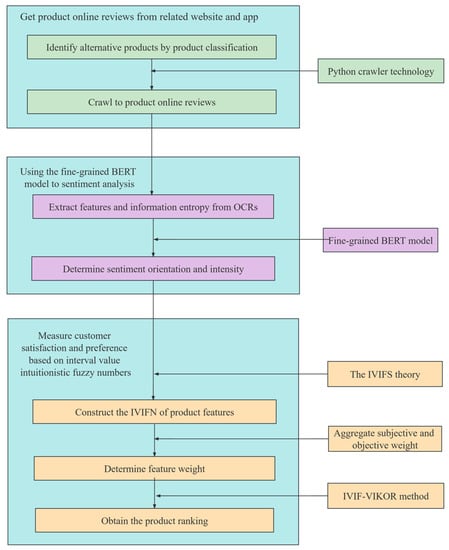 The proposed method in this paper consists of three phases. The first phase classifies products to determine alternative products and crawl OCRs of alternative products. Next, the second phase extracts the aspects that concern consumers from the OCRs to construct a three-level evaluation system, using aspect-level SA to identify the sentiment orientations of sub-criteria through the fine-grained BERT model. The third and final phase constructs interval intuitionistic fuzzy numbers (IVIFNs) based on interval intuitionistic fuzzy sets theory to rank the alternative products with the improved IVIFN-VIKOR. The process of this proposed methodology is shown in Figure 1. We combine objective weight with subjective weight. The opinions of consumers who have purchased products also take into account the personal purchase preferences of potential consumers. In addition, the interval-valued intuitionistic fuzzy number is used to represent product performance, which reduces the impact of the number of online comments on the consistency of decision data and makes the results more accurate.