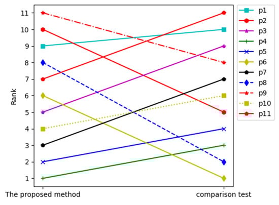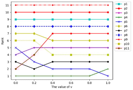 As shown in Figure 3, the rankings of products P3, P4 and P11 gradually increase with the decrease in decision makers’ risk preference degree value. This indicates that, when decision makers pay more attention to the best interests, they are more satisfied with products P3, P4 and P11. At this time, decision makers are more satisfied with product P11, because product P11 increases more significantly with decision makers favoring group interests. Similarly, the rankings of P5, P6 and P10 increase with the increase in decision makers’ risk preference degree . This means that decision makers are more satisfied with P5, P6 and P10 when they pay more attention to their minimal regrets. In addition, the rankings of products P1, P2, P8 and P9 are not affected by the change in value, which indicates that no matter whether decision makers pay more attention to the maximum benefit of all or the minimum personal regret, they have low satisfaction with P1, P2, P8 and P9.