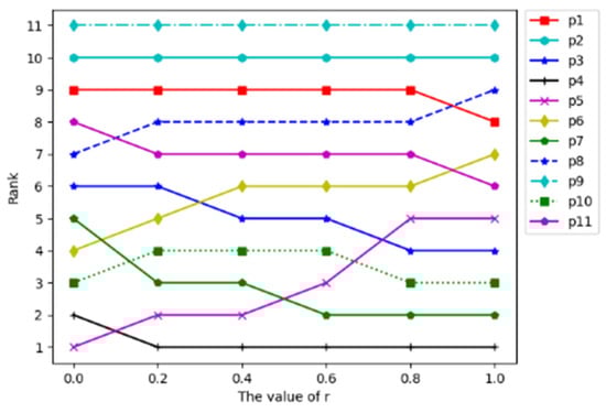 Figure 4 shows the change in product ranking as the weight fusion coefficient of individual preference weight and collective attribute weight changes from 0 to 1. As shown from Figure 4, the rankings of products P1, P3, P4, P7 and P11 also improve with the increasing value. Similarly, the rankings of P5, P6 and P8 decrease as the value increases. In addition, the rankings of P2 and P9 are not affected by the value, and the rankings of P2 and P9 do not change no matter how the r value changes. This indicates that both individual and collective preferences are dissatisfied with P2 and P9, which means that P2 and P9 are unsatisfactory for all customers. Due to , individual preference plays an increasingly important role with the increase in r. Customers’ personal preference for products has a greater impact on the final ranking result, and the decision result is highly subjective. On the contrary, the opinions of consumers who have purchased products have a greater impact on the final ranking results, and the decision results lack individuation. Hence, we combine objective weight with subjective weight. Considering not only the opinions of consumers who have bought products but also the personal preferences of consumers who want to buy products can help potential consumers choose more satisfactory and suitable products.